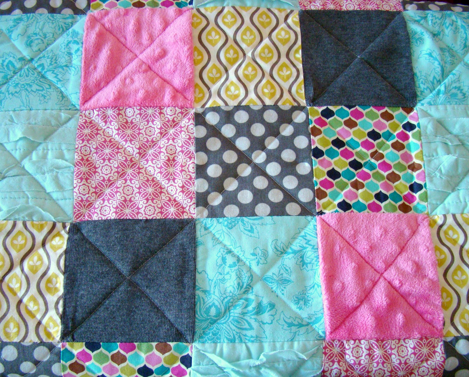So I went through my scraps...I didn't want to go out and purchase a bunch of fabric, just in case things went amiss. I knew I wanted to use different textures and patterns since I would be using this as a little tummy time mat for baby. So I got creative and pulled out some knit, minky, and even a ruffled pillow sham that I had left over from the nursery pillows.